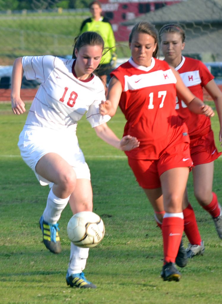 Gadsden City’s Owen Hicks (18) and Hewitt-Trussville’s Lacy Lemaster (17) battle for possession during the Lady Titans’ 3-0 loss in the second round of the Class 6A girls state soccer tournament on Tuesday (Apr. 30) at GCHS. Gadsden City finished the season with a 10-8-1 record.