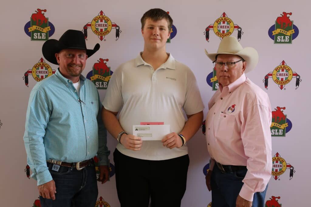 Photo and blurb submitted. Eli Suther, of Southside, was awarded a scholarship by the Poarch Band of Creek Indians (PBCI) for his participation in Alabama’s livestock industry on Sunday, March 22 at a ceremony held in coordination with the Southeastern Livestock Exposition (SLE) Rodeo. Pictured L-R are PBCI Member and Perdido River Farms Director John English; Eli Suther; and SLE President-Elect Galen Grace.