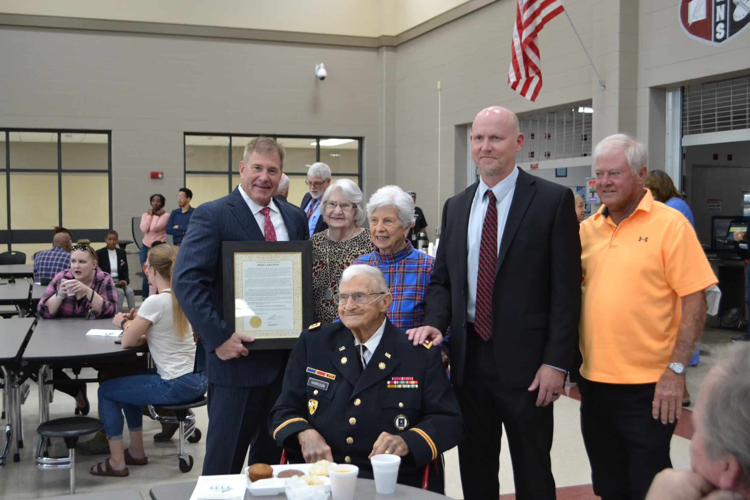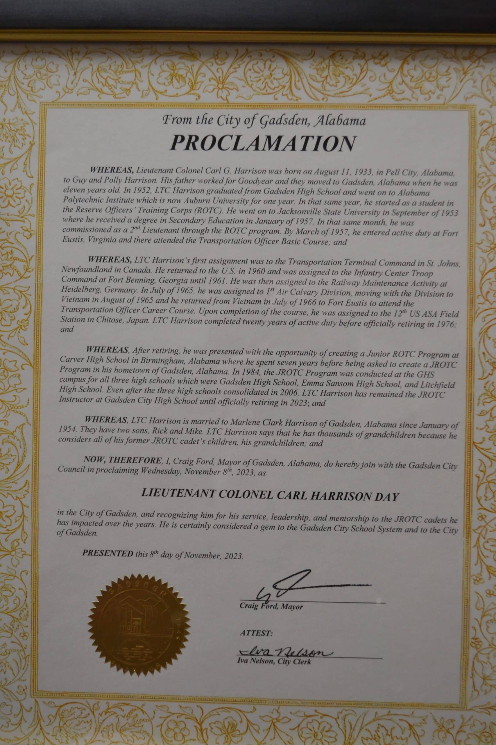 Gadsden Mayor Craig Ford, who stated he was not ordinarily an emotional man, was fighting back tears while presenting Harrison with an official proclamation naming Wednesday, November 8, 2023, “Lt. Col. Harrison Day” in the City of Gadsden.