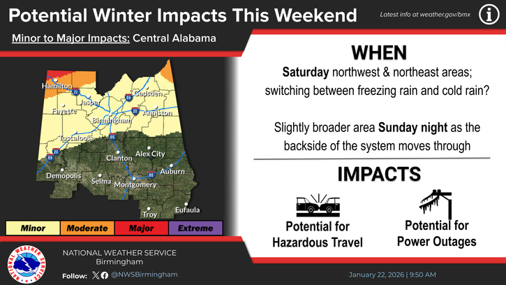 For Etowah County and surrounding northeast Alabama, a cold air damming pattern could increase icing potential late Saturday or Saturday night. A brief warm-up with cold rain is possible Sunday morning, followed by a rapid temperature drop later in the day.