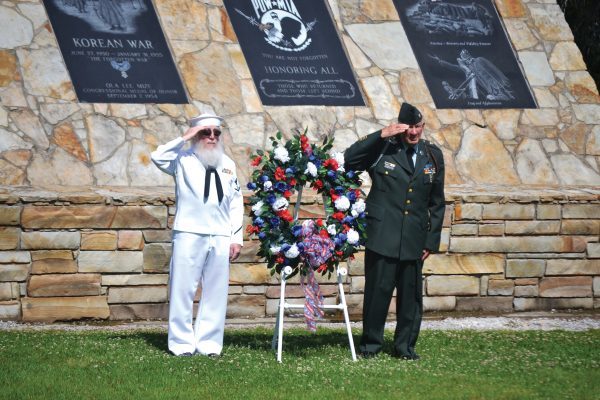 Sgt. Frank Godfrey and Petty Officer Edward Moon laid a ceremonial wreath on the stone war marker honoring veterans as Gadsden City High School band director Steve Reagan concluded the memorial with “Taps.”