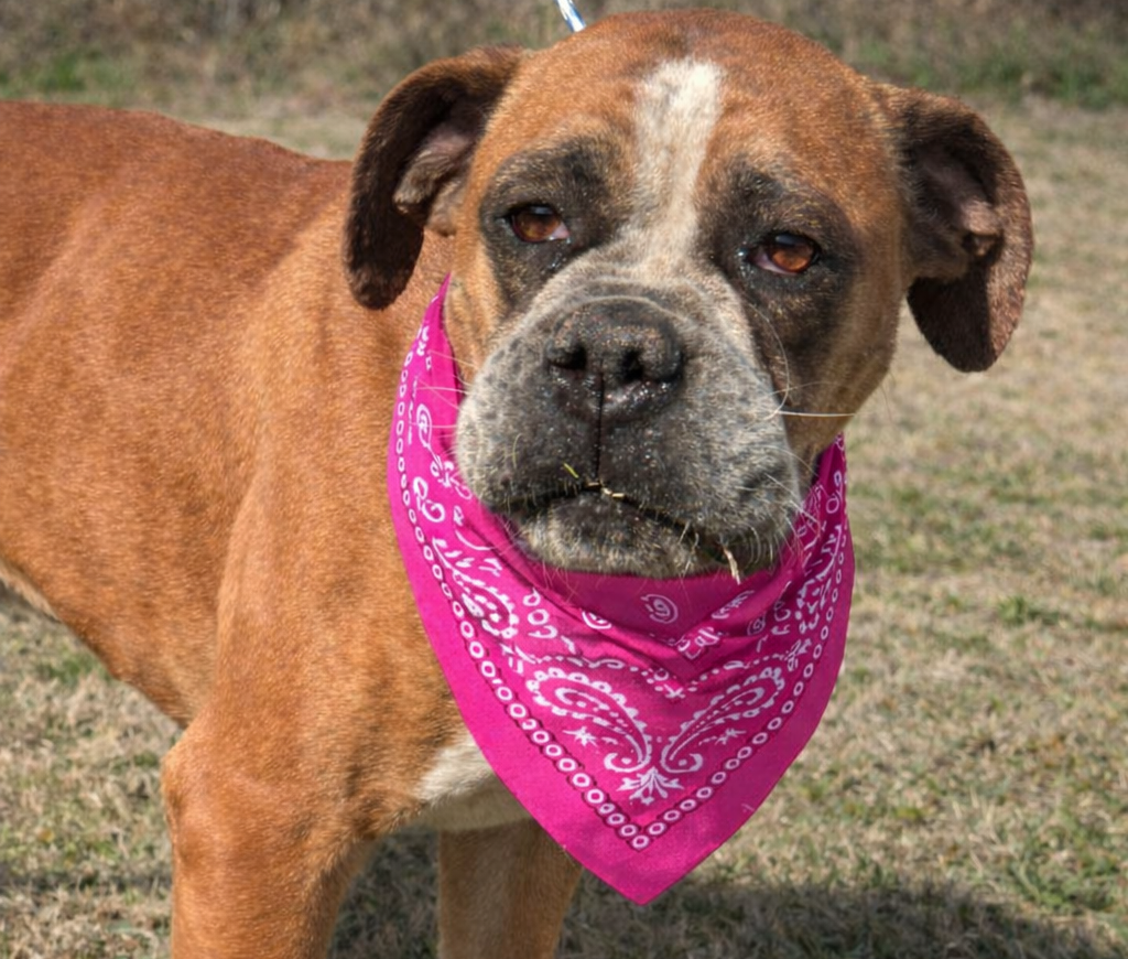 Clarabelle is our first featured pet. She is a sweet boxer mix, around 5 years old, with a gentle personality who would make a wonderful companion. (Pink bandana)