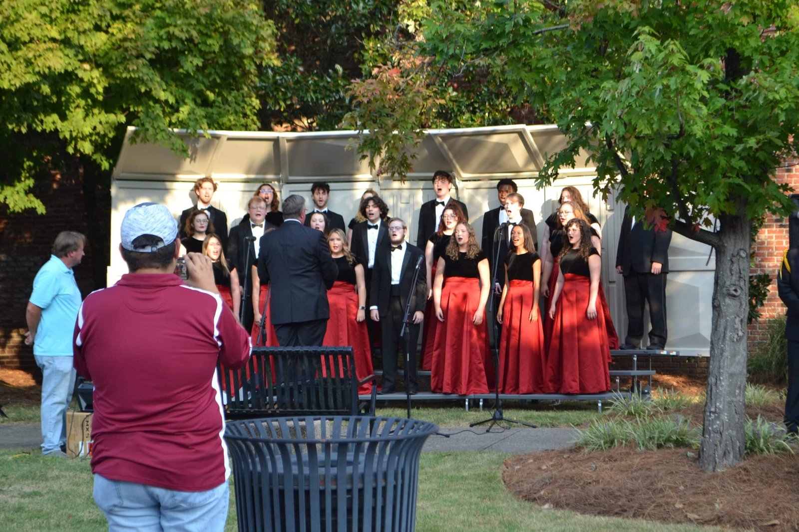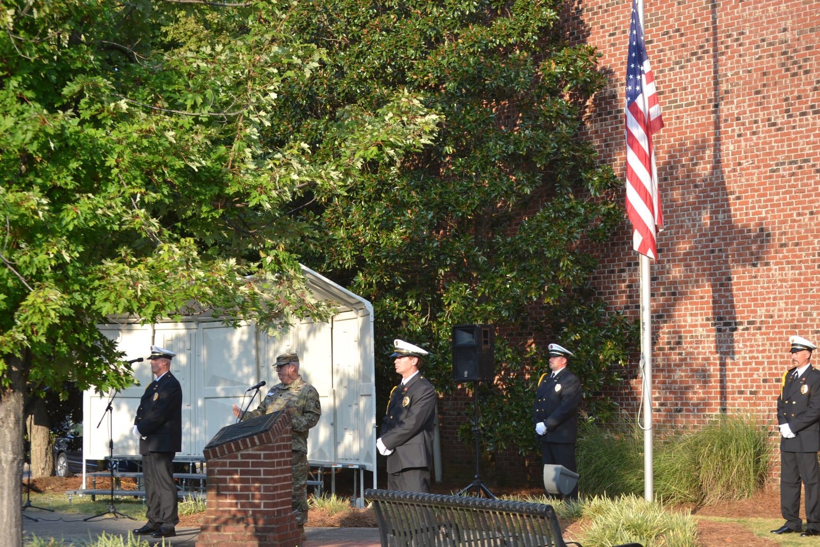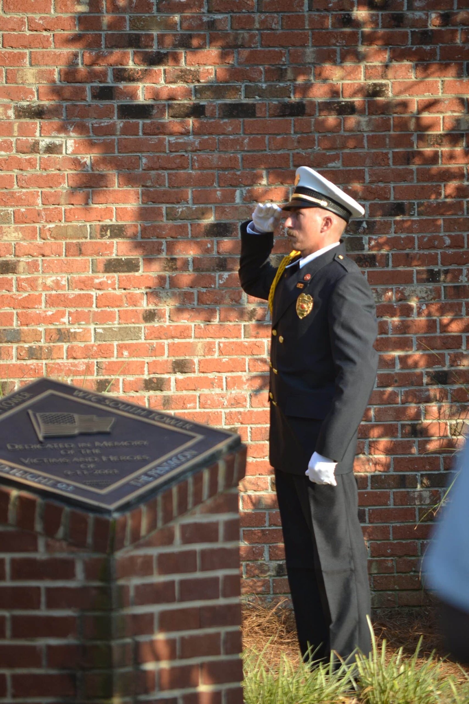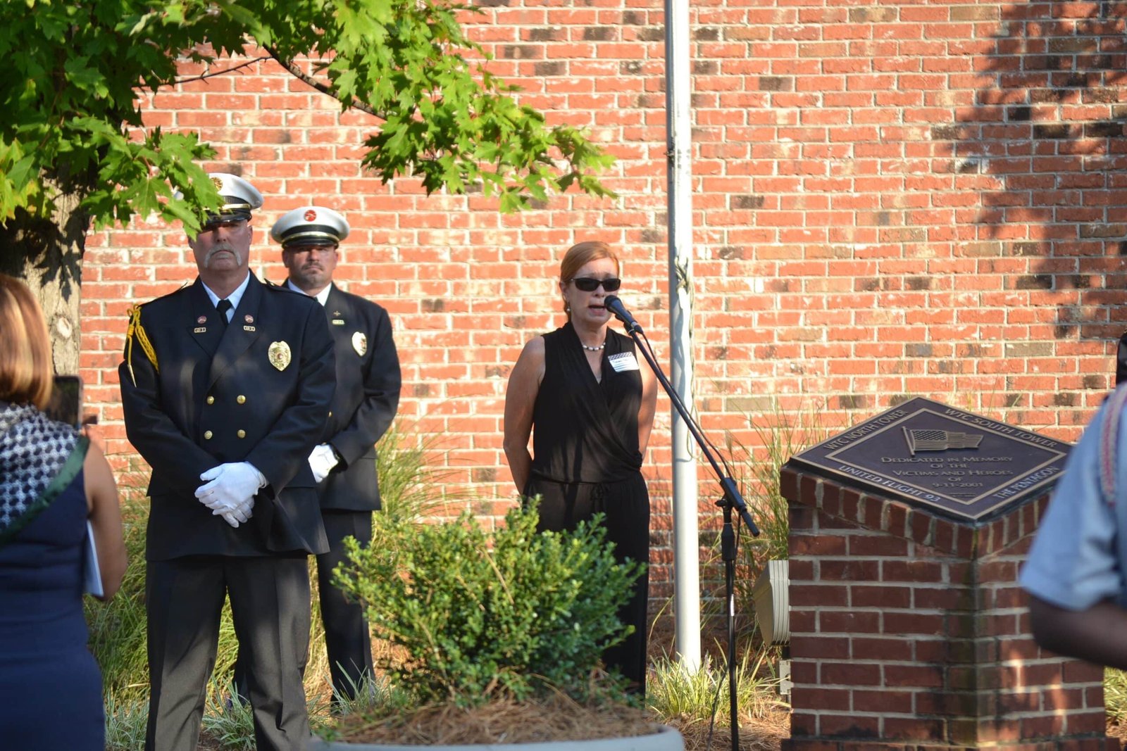 Tiffany Parnell, chairman of the Gadsden Beautification Board welcomed attendees and introduced the various speakers and performances. Dr. Cynthia Toles gave the invocation, the Gadsden Firefighter Honor Guard led the Pledge of Allegiance, Gadsden City Clerk Iva Nelson sang the National Anthem and the GFD Honor Guard lowered the American flag flying at the memorial site. Col. Wayne Davenport gave the keynote speech before the Gadsden State Show Choir directed by J.T. Harrell performed several patriotic songs. Attendees then joined in a moment of silence as the Gadsden Fire Department rang the bell, a tradition which honors fallen firefighters. Taps, the national song of remembrance, was then played on trumpet. Jim Feely, who witnessed the attacks on September 11, 2001, played the bagpipes before and after the event.