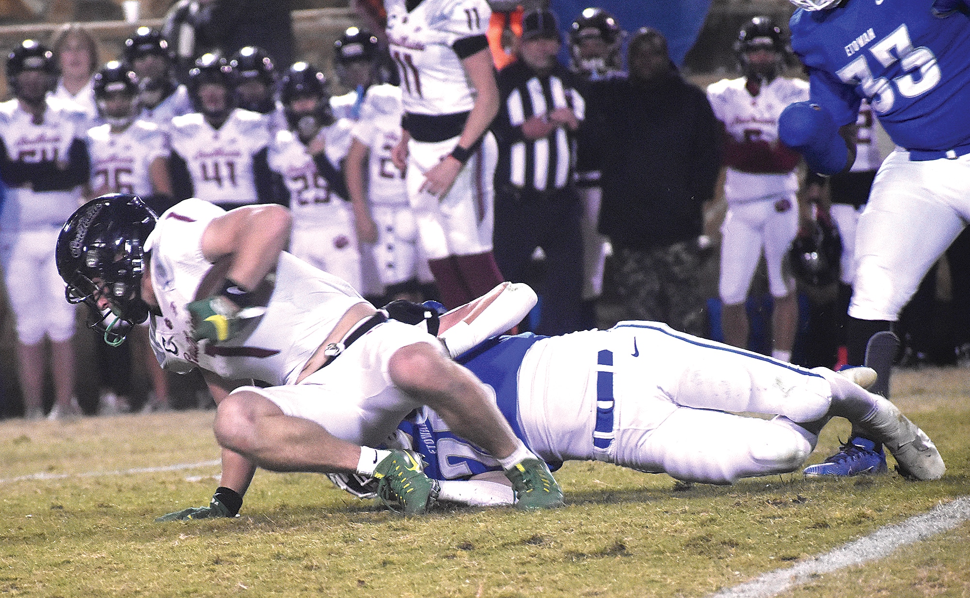 Photo: Southside’s Mason Teague stretches for yardage while being tackles by Etowah’s Cam Naylor during the Panthers’ 45-17 victory in high school football on Nov. 3 in Attalla. (Chris McCarthy/ Messenger)