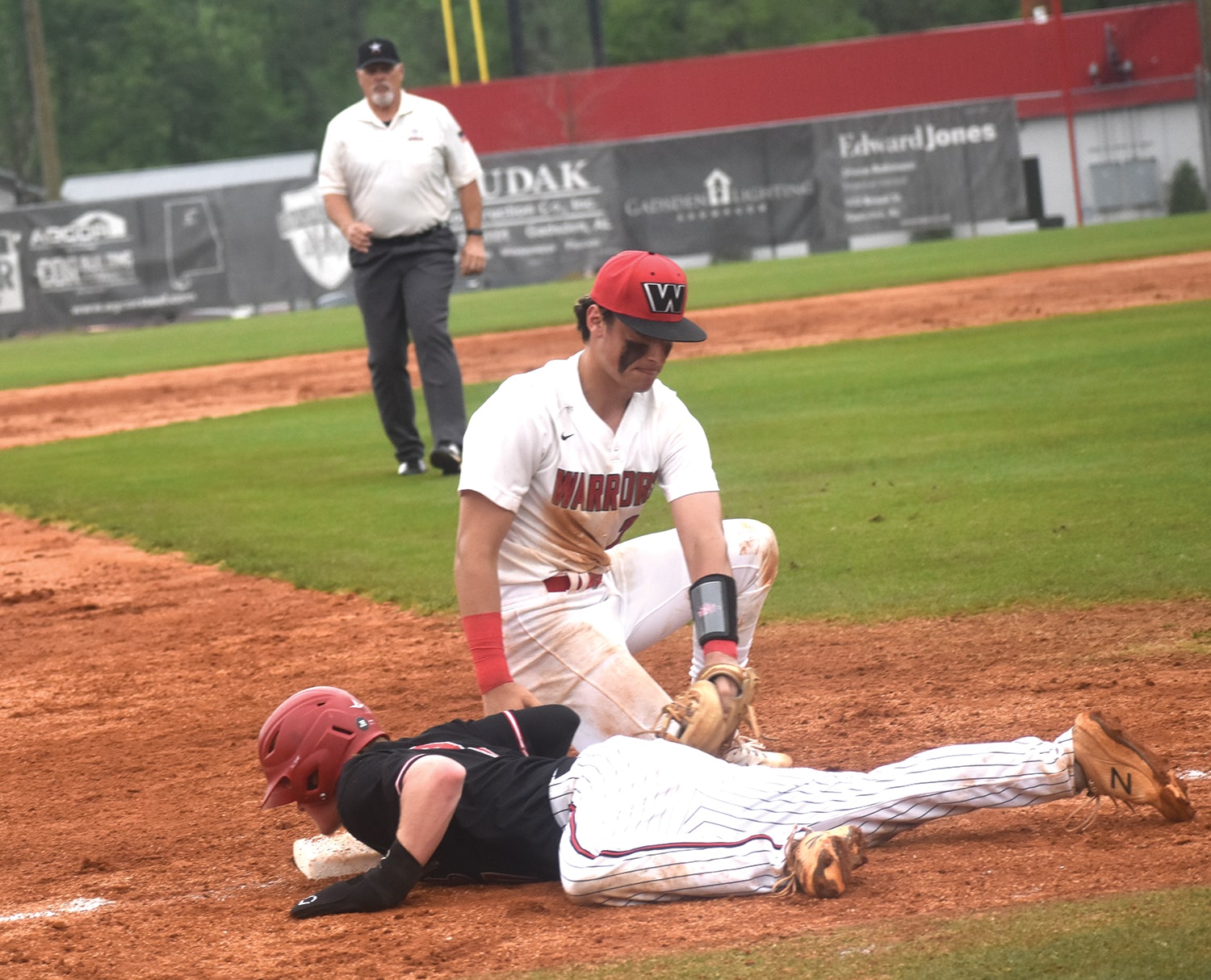 Photo: Westbrook Christian’s Noah Wrigth applies a tag to Elkmont’s John Doner during the Warriors’ two-game sweep in the first round of the Class 3A state baseball playoffs on Thursday, April 18, in Rainbow City. (Chris McCarthy/Messenger)